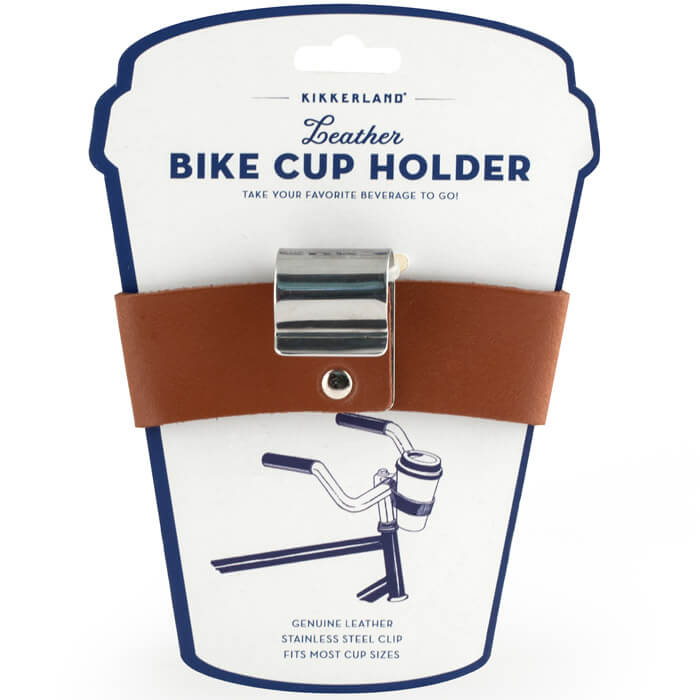 Der Getränkehalter ist einfach am Lenker zu befestigen und die Lederschlaufe hält den Becher bei allen Strassenunebenheiten sicher am Platz. Das perfekte Geschenk für radelnde Kaffeejunkies!
