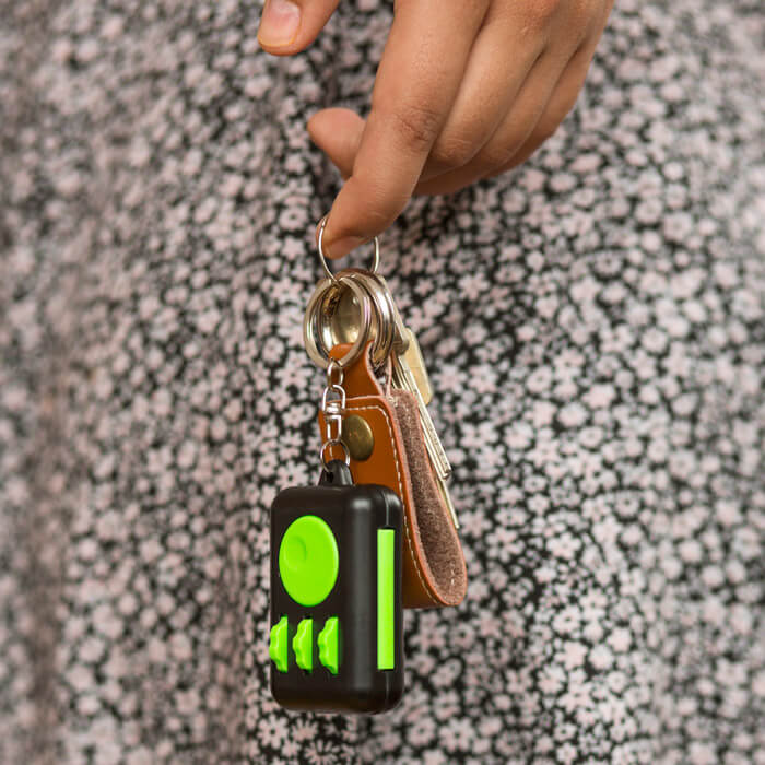 Der Schlüsselanhänger hat jede Menge Knöpfe, Zahnräder und Schalter mit denen man seine nervösen Hände und Finger beschäftigen kann.